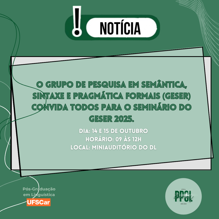 O Grupo de pesquisa em Semântica, Sintaxe e Pragmática Formais (GeSER) convida todos para o Seminário do GeSER 2025.