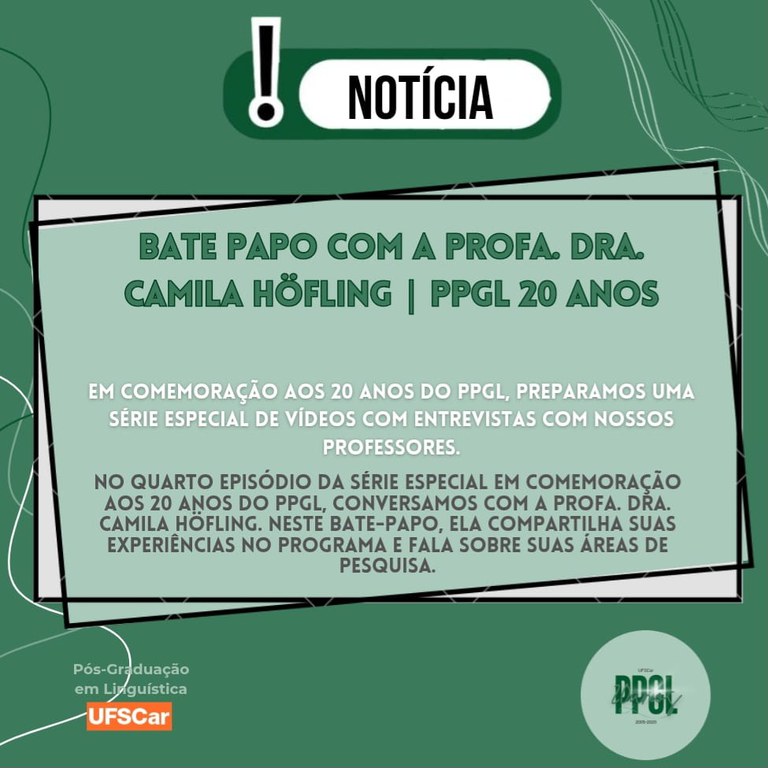 No quarto episódio da série especial em comemoração aos 20 anos do PPGL, conversamos com a Profa. Dra. Camila Höfling. Neste bate-papo, ela compartilha suas experiências no programa e fala sobre suas áreas de pesquisa.