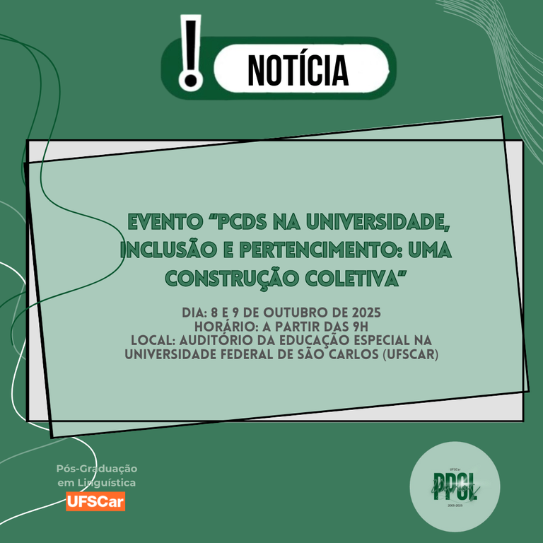 Nos dias 8 e 9 de outubro irá acontecer o evento “PCDs na Universidade, Inclusão e Pertencimento: uma construção coletiva”  no Auditório Da Educação Especial na Universidade Federal de São Carlos (UFSCar).