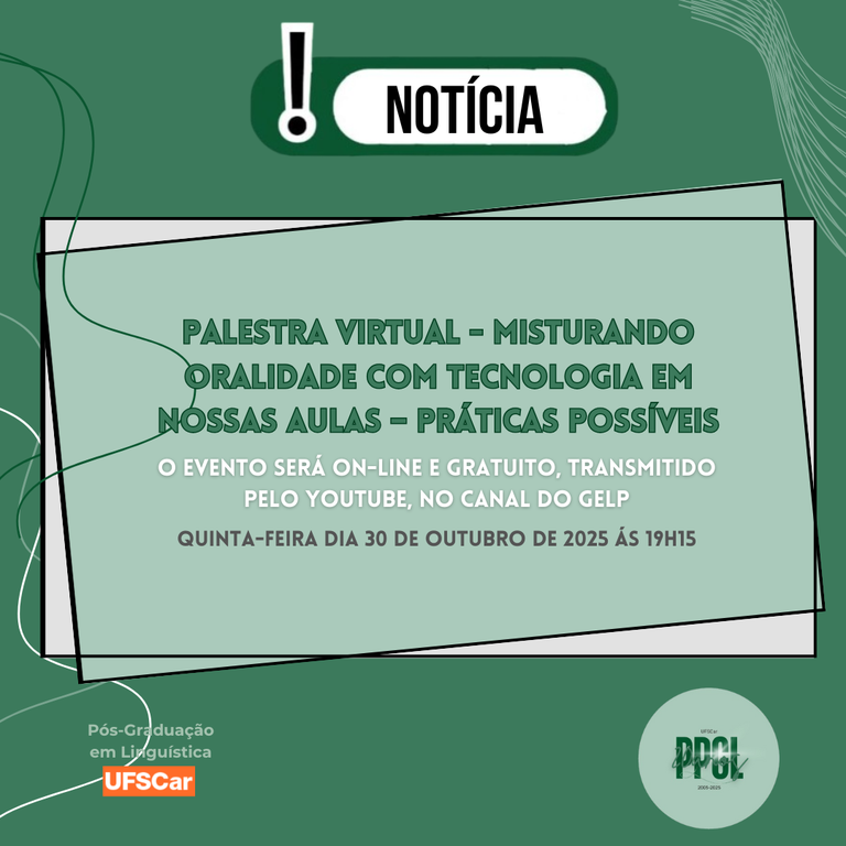 O Grupo de Estudos em Língua Portuguesa (GELP/UFPE), grupo de pesquisa cadastrado no CNPq com sede na UFPE e funcionamento também na UFCG. Tem o prazer de convidá-los para assistir à palestra Misturando oralidade com tecnologia em nossas aulas – práticas possíveis, que acontecerá na última quinta-feira útil deste mês, dia 30 de outubro de 2025, às 19h15, e será proferida pela Profa. Dra. Carolina Alves Fonseca (CAp/ João XXIII/ UFJF).